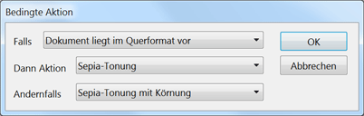 Ein Beispiel: Im Screenshot oben wird die Aktion "Sepia-Tonung" abgspielt, wenn das Bild im Querformat vorliegt, was bedeutet, dass dessen Breite größer ist als dessen Höhe. Wenn das Bild nicht im Querformat ist, also wenn es quadratisch ist oder eine Hochkantausrichtung hat, dann wird die Aktion "Sepia Tonung mit Körnung" aus dem aktuellen Set abgespielt.