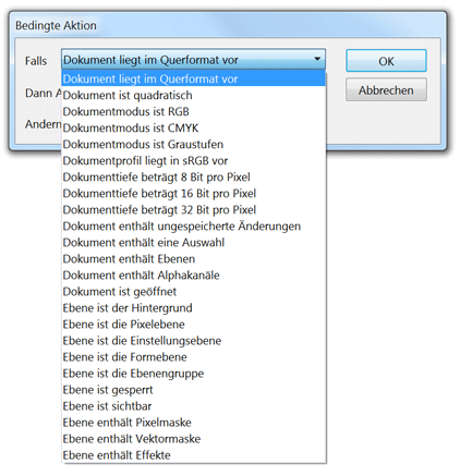 Sie können zwischen 24 Bedingungen im Falls-Kombinationsfeld auswählen. Sie reichen von Eigenschafte des aktuellen Dokuments bis zu Eigenschaften der aktuellen Ebene. Hier ist eine Liste aller Bedingungen sowie einer ensprechenden Erklärung: