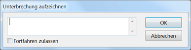 Der Bedienfeldmenüpunkt "Unterbrechung einfügen" ermöglicht Ihnen, eine Nachricht einzugeben, die während des Abspielens der Aktion angezeigt wird. Zum Eingeben dieser Nachricht sehen Sie eine neuen Dialog mit einem Textfeld. Geben Sie Ihre Nachricht im Textfeld ein und aktivieren Sie das Kästchen "Fortfahren zulassen", wenn Sie möchten, dass mit dem Abspielen der Aktion fortgefahren werden kann, nachdem die Nachricht angezeigt wurde.