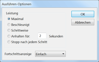 Anhalten für x Sekunden | Falls die Aktion "Schrittweise" die Aktion für Sie zu schnell abspielt, um zu beobachten, was geschieht, können Sie diese Option verwenden. Sie macht eine Pause von 1, 2 oder mehr Sekunden nach jedem Aktionsschritt. |
