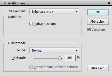 Die Inhaltssensitiv-Option funktioniert nur in Photoshop Elements 13 und höher falls eine Auswahl existiert. Sie füllt automatisch die Auswahl mit Bildinhalt von außerhalb der Auswahl und versucht, das Bild zu reparieren. Indem Sie das Kästchen Farbanpassung aktivieren, können Sie eine alternative Version des Algorithmus verwenden, der versucht, die Farben anzupassen.