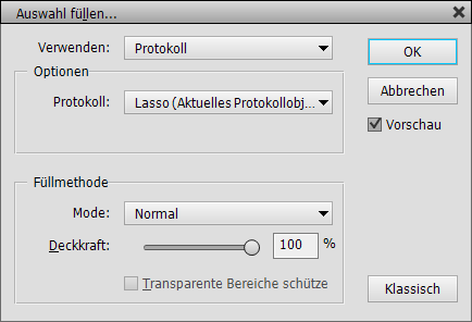 Die Protokoll-Option ermöglicht, die Auswahl oder Ebene mit einem Bild aus einem anderen Protokolleintrag zu füllen. Bitte wählen Sie den Protokolleintrag aus dem Protokoll-Kombinationsfeld aus.