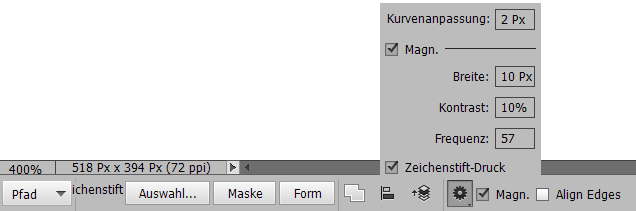 Das Zeichenstift-Werkzeug ermöglicht das Erstellen eines Pfades durch Klicken auf das Bild. Jeder Klick definiert einen neuen Ankerpunkt. Wenn Sie klicken, die Maustaste aber gedrückt halten, können Sie die Maus bewegen, um die Krümmung des neu erstellen Pfadabschnitts zu verändern. Wenn Sie erneut auf den ersten Ankerpunkt klicken, wird der Pfad geschlossen.