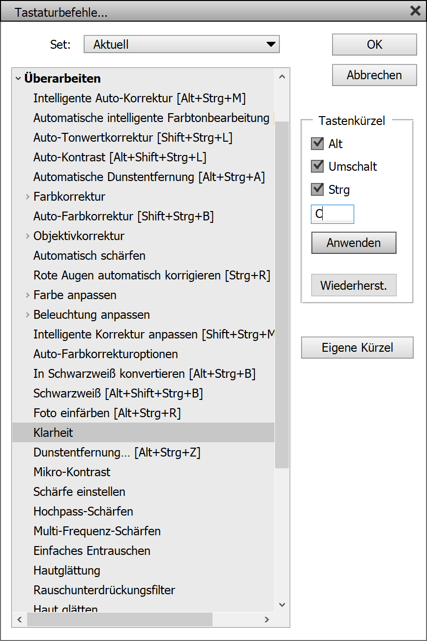 Um eine neue Tastenkombination zu definieren, wählen Sie den entsprechenden Menüpunkt in der Liste aus, aktivieren Sie dann die Kontrollkästchen Alt, Umschalt und/oder Strg und geben Sie einen Buchstaben, eine Zahl oder F1 bis F12 in das Textfeld ein. Klicken Sie dann auf die Schaltfläche Anwenden, um die Tastenkombinationen zu aktivieren. Um die Tastenkombination des ausgewählten Elements wiederherzustellen, klicken Sie auf die Wiederherst.-Schaltfläche. Klicken Sie auf die Schaltfläche Eigene Kürzel, um eine Liste aller Tastenkürzel anzuzeigen, die mit diesem Dialogfeld definiert wurden.