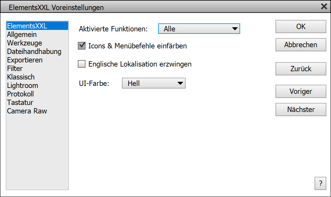 Wenn Sie diesen Menüpunkt im Voreinstellungen-Untermenü klicken, wird ein Dialogfenster geöffnet, mit dem Sie die Einstellungen von Elements XXL ändern können. Sie können zwischen verschiedenen Einstellungsgruppen wählen, indem Sie die Liste rechts verwenden oder Voriger und Nächster anklicken. Um alle Optionen auf die vorherigen Ausgangseinstellungen zurück zu setzen, klicken Sie auf die Zurück-Schaltfläche. Drücken Sie OK, um die Änderungen anzuwenden oder auf Abbrechen, um sie für ungültig zu erklären.
