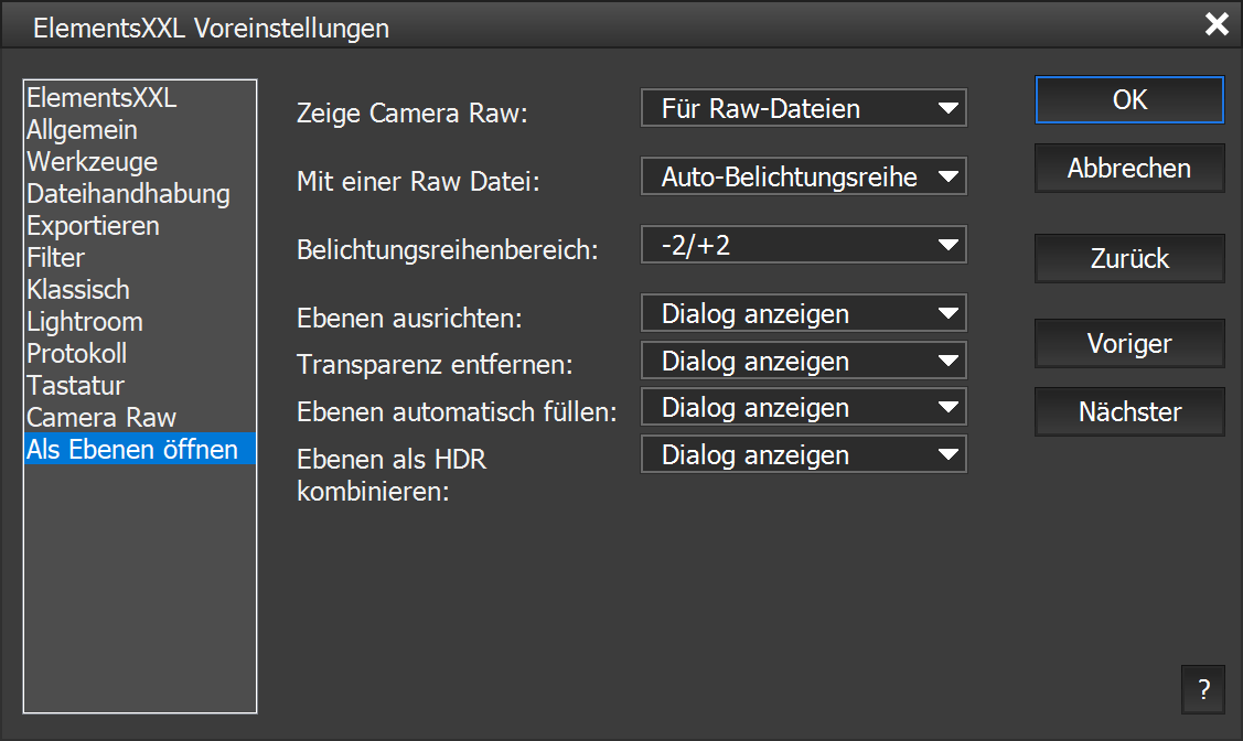 Belichtungsreihe öffnet einfach nur die Datei. Die Option Auto-Belichtungsreihe zeigt