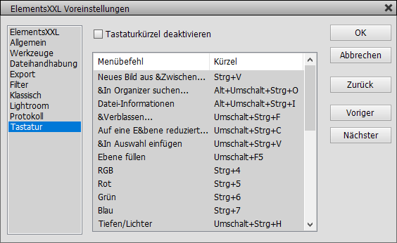Das Kästchen Tastaturkürzel deaktivieren deaktiviert (und reaktiviert) die Tastaturkürzel von ElementsXXL. Alle aktuell verfügbaren Tastaturkürzel werden in der Liste darunter angezeigt.