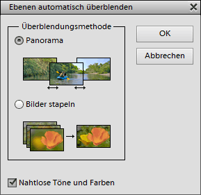4. Wählen Sie Bilder stapeln aus den Überblendungsmethoden aus. Wenn gewünscht, aktivieren Sie das Kästchen für nahtlose Töne und Farben. Drücken Sie schließlich auf OK.
