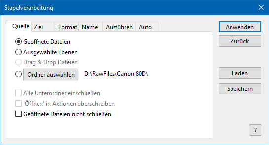 5. Auf der Quelle-Registerkarte des Stapelverarbeitungsdialogs aktivieren Sie die Option "Geöffnete Bilder" oder "Ausgewählte Ebenen".