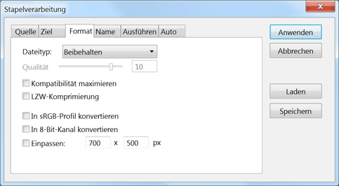 7. Sofern Sie die Dokumente in der Größe verändern oder diese in RGB oder 8 Bits/Kanal konvertieren wollen, aktivieren Sie die passenden Optionen in der Format-Registerkarte.
