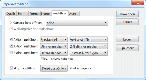 8. In der Ausführen-Registerkarte können Sie bis zu drei Aktionen und ein Skript auf die Bilder anwenden. Außerdem können Sie keines, das erste oder jedes Bild durch Camera Raw laufen lassen.