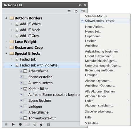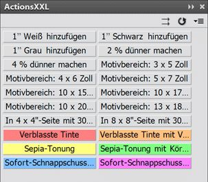 1. Wenn Sie eine Stapelverarbeitung mit Bilddateien vorhaben, schließen Sie am besten alle offenen Dokumente. Stellen Sie sicher, dass die Aktion(en), die Sie auf Bilddateien anwenden wollen im ActionsXXL-Fenster angezeigt werden.