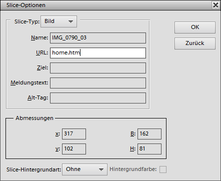 5. Um ein Slice mit einer URL oder einer html-Datei Datei zu verknüpfen, rechts-klicken Sie ein Slice und wählen Sie "Slice-Optionen bearbeiten" vom Kontextmenü. Im Dialog Slice-Optionen tippen Sie den Namen einer html-Datei Datei oder eine http-Webadresse im URL-Textfeld ein und klicken Sie auf OK.