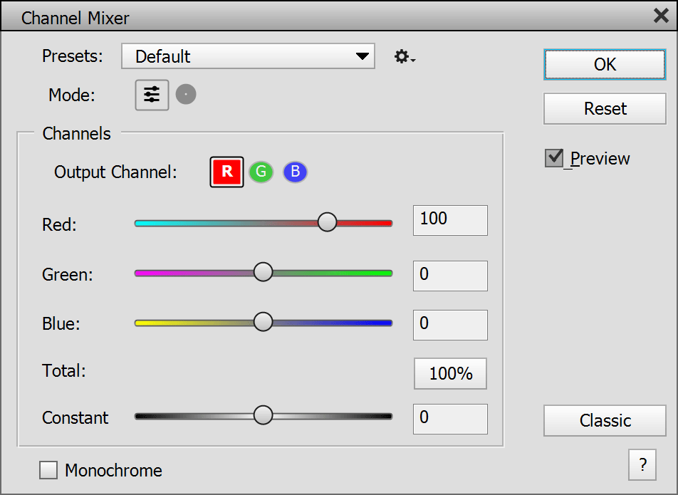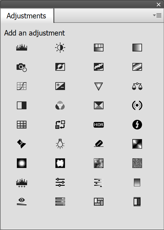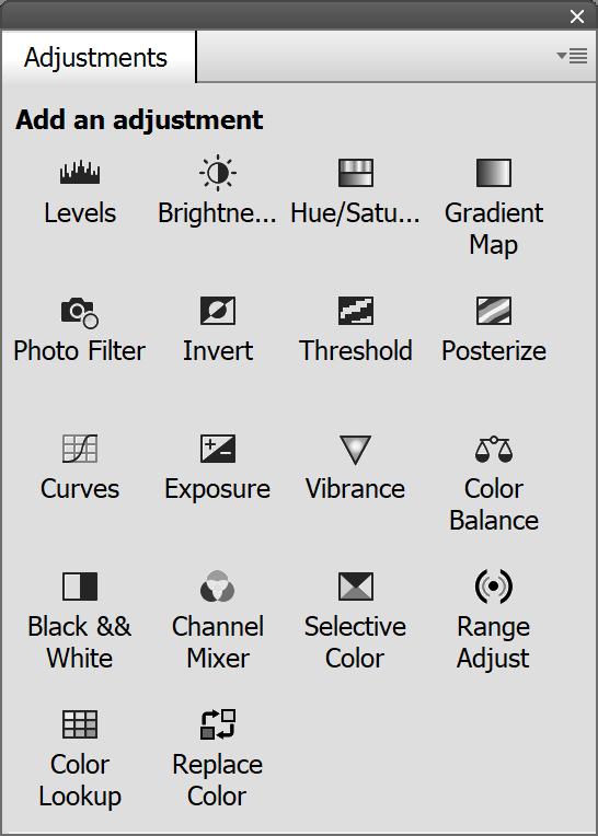 NEW: Most ElementsXXL adjustment layer can be edited directly on the Adjustments panel, which is displayed all of the time. The Channel Mixer can now also be edited here and Curves now offers its four tools on the Adjustments panel. Two new icons, including an icon menu, are also added.
