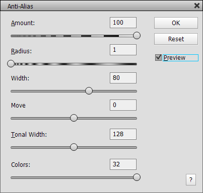 The Anti-Alias filter adds an anti-alias effect if only black & white pixels, but produces a water color effect for color images.