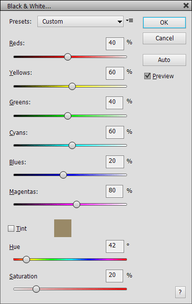NEW: The dialog of the new Black & White filter and adjustment layer with new preset and Auto features.