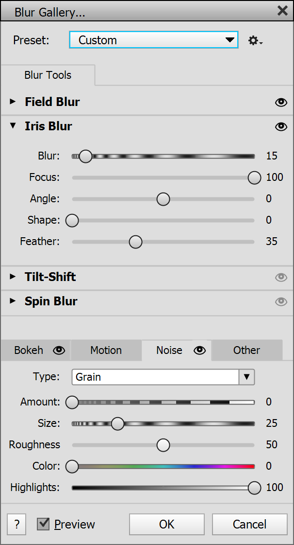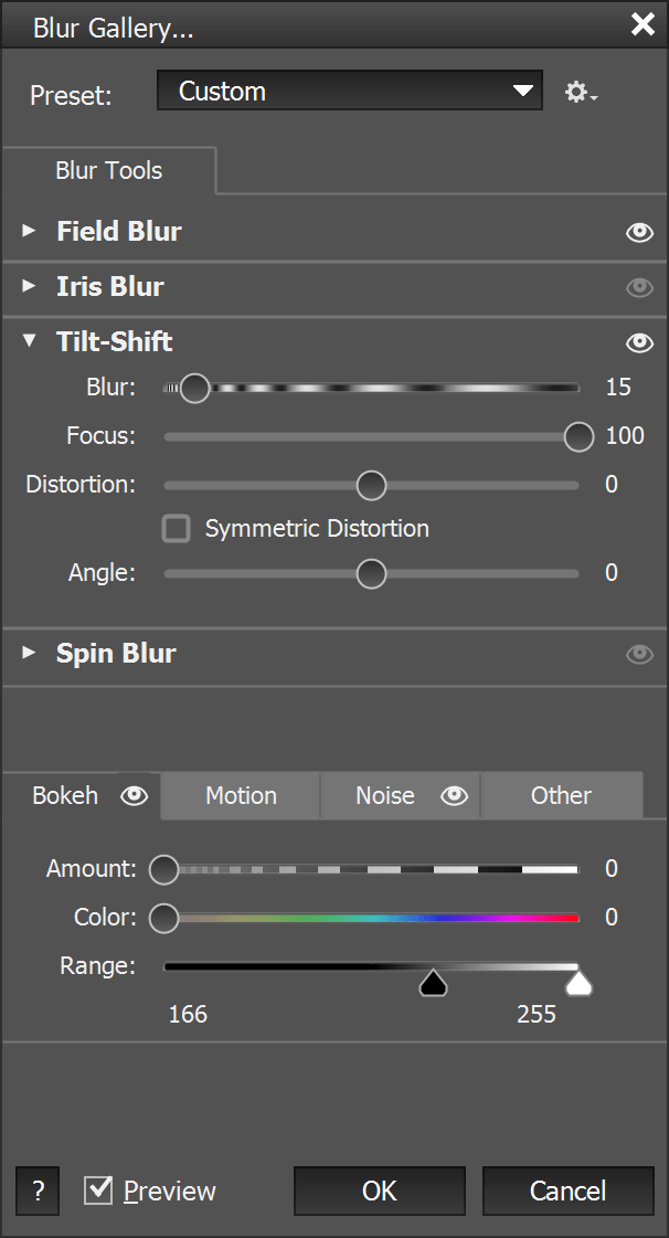 NEW: Blur Gallery for creating and combining sophisticated blur effects. They are set as blur spots directly on the image. Unlike the same feature in Photoshop you also get a preset feature and are able to edit the effect again after clicking OK.