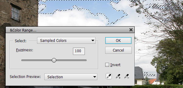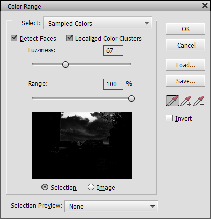 The Color Range dialog creates selections based on colors and tones. In this case the blue color was selected by clicking on the image.