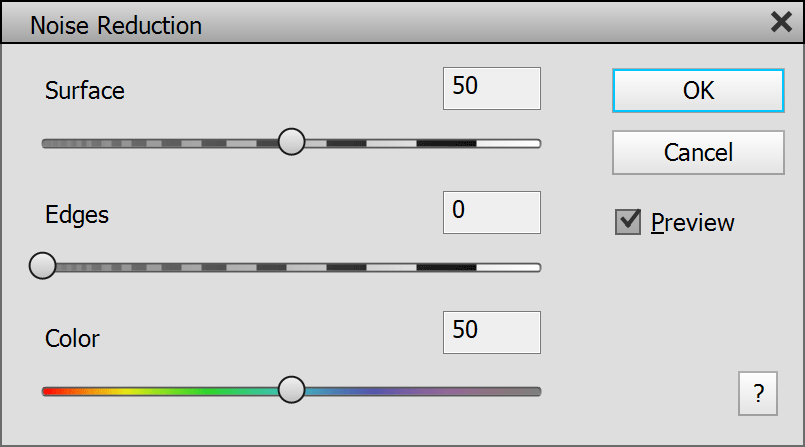 NEW: The Noise Reduction dialog removes luminance and color noise with the help of 3 sliders