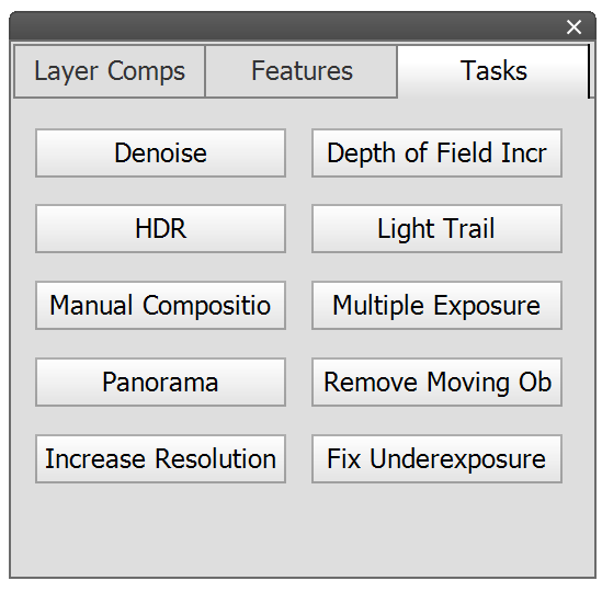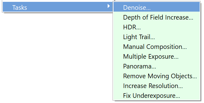 The Image > Tasks sub menu with the light green LayerShop menu items.
