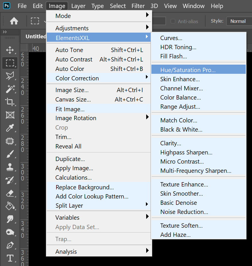 ElementsXXL adds 9 new sub menus and dozens of menu items to the Layer Menu. The added items have a blue background in this screen shot.