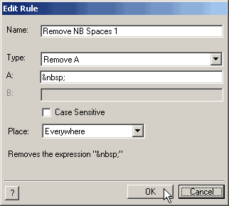 7. To replace the word "Harold" with "Harry", select "Replace A with B" from the Rule combo box, enter Harold in the A text box, enter Harry in the B text box, activate the Case Sensitive check box and select "Only Outside Tags " from the Place combo box. This setting will replace all occurances of Harold outside tags with Harry.