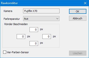 Die vier Textfelder Ränder Beschneiden ermöglichen Ihnen, festzulegen, wie viel Pixel oben, links, rechts und unten im Bild weggeschnitten werden. Dies ist erforderlich, wenn Sie gemerkt haben, dass die geöffneten Rohbilder entweder einen schwarzen Rand haben oder an den Rändern Artefakte aufweisen. Da Bayer-Sensoren aus einem 2 x 2 - Gitter bestehen, kann es vorkommen, dass das Abschneiden des oberen und linken Randes Falschfarben produziert. In solch einem Fall versuchen Sie, den Wert für oben und dann den für links um 1 zu erhöhen.
