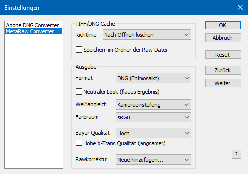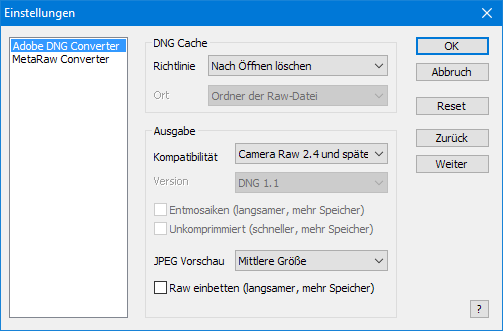 Mit dem Einstellungen-Fenster können Sie die Parameter von Adobe DNG Converter und dem eigenen Rawkonverter von MetaRaw anpassen.