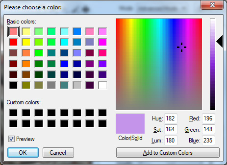 When the Host Color Dialog check box is deactivated, BWStyler uses an advanced version of the color dialog of the operating system. It shows the effect of a chosen color in the preview while the color dialog is still displayed. You just need to make sure that the Preview check box on the color dialog is activated. The host color dialog always has to be closed in order to see the effect of the chosen color and you need to reopen it to choose another color, which is less convenient.
