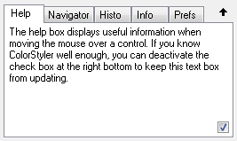 The Help sheet is located at the right bottom of the BWStyler window. This feature was built in to make it easier for beginners to get started and makes it possible to use BWStyler without having to refer to the manual. When you move your mouse over a certain control, the text box will display some explanations and hints about the control.