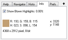 When moving the mouse over the preview, the color below the cursor is shown in the color box of the Info tab sheet. Additionally the color is shown as RGB and HSL values. The x and y values represent the image coordinates of the pixel whose color is shown. For images with 16-bit/channel the color values are shown as 8-bit values like in Photoshop.