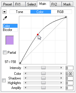 The Main tab sheet contains a curve tool and sliders for adjusting the brightness, contrast and color of the whole image. Click on the sub tab bar at the top of the tab sheet to switch between different control groups.