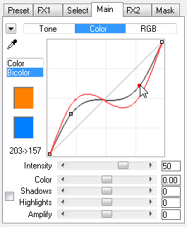 There are six different curves plus five sliders for each curve. One curve is located on the Tone sub tab, two are on the Color sub tab and three on the RGB sub tab in Advanced Mode. In Advanced+ Mode you can choose these six curves from the Effect combo box. Each of them changes different image values. The Tone curve affects all pixel values (thus producing brightness and contrast adjustments), the Color and Bicolor curves colorize the image with one or two colors and the three RGB curves affect the three color channels individually.