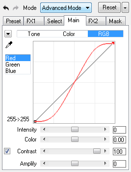 The Intensity slider increases or decreases the amplitude of the curves and the intensity of the controls on the RGB sub tab. It influences both the black curve as well as the other sliders below the curve. Slider values below zero make the red output curve move towards the base line thus decreasing the color effect. Values above zero make the red curve move further away from the base line thus increasing the color effect. At a value of zero the Intensity slider does not influence the curve and the sliders.