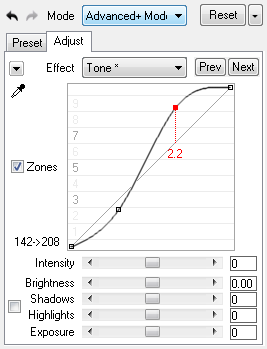 The Intensity slider increases or decreases the amplitude of the curve and the intensity of the controls on the Tone sub tab. It influences both the black curve as well as the other sliders below the curve. Slider values below zero make the red output curve move towards the base line thus decreasing the Tone effect. Values above zero make the red curve move further away from the base line thus increasing the Tone effect. At a value of zero the Intensity slider does not influence the curve and the sliders.