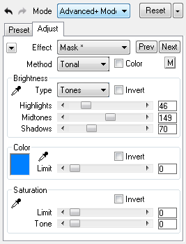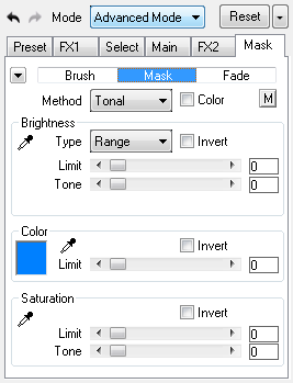 The Tonal method contains three options for creating masks based on brightness, color and saturation values of the original image. You can use all three groups at the same time or only one. Each group contains an Invert slider, which makes masked areas unmasked and vice versa.