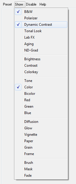 The Disable menu displays the names of the currently active BWStyler effects. Clicking a menu item disables the selected effect. This can be useful for removing individual effects of a preset that you do not want to use, e.g. the grain or brightness adjustments.
