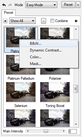 Photography mode consists only of presets that are sorted into a dozen combo boxes. Each combo box offers many items for adding a predefined effect, a so-called preset, to the image. This way you can add up multiple effects at the same time to an image. The presets of one combo box override each other (except for Neutral, Development and Tonal FX), but if you choose presets from different combo boxes, their effects are combined. It works similar to the activated Combine check box in Easy and the advanced modes.