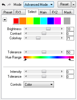 There are also two additional sliders called Tolerance and Hue Range, which are not available when the Controls combo box is set to "Tonal". The Tolerance slider controls the mask intensity of the selected color, which in turn influences the effect intensity of the brightness, contrast and colorkey sliders. Slider values above 50 amplify the mask whereas lower values suppress it. Values above 90 can produce artifacts, because the color mask might be stretched too much.