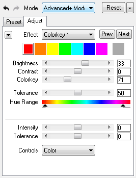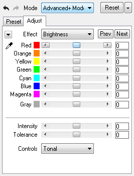When you select "Tonal" in the Controls combo box at the bottom of the tab sheet you will see three sub tabs at the top in Advanced Mode. Each sub tab contains seven or eight color sliders for adjusting the brightness, contrast and color recovery of image areas with a certain color. In Advanced+ Mode there are no sub tabs, but you can choose the same three items from the Effect combo box. Move the sliders to the left to decrease the brightness, contrast and color key effect and move them to the right to increase them. Double click the slider label to reset a slider to zero.