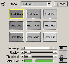 The Intensity slider controls the strength of the effect and the Radius slider controls its smoothness of the mist. The Threshold slider lets you expand the mist effect to other image areas and the Color Filter slider influences the location of these image areas.