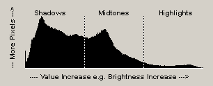 In B/W Styler the histogram curve is separated into three areas: the shadows on the left side (with values from 0 to 85), the midtones in the middle (with values from 86 to 170) and the highlights on the right side (with values from 171 to 255). B/W Styler displays all three areas equally wide, although some people may argue that the midtones are twice as wide as the shadows and the highlights. But usually it is more useful to define the three areas equally wide.