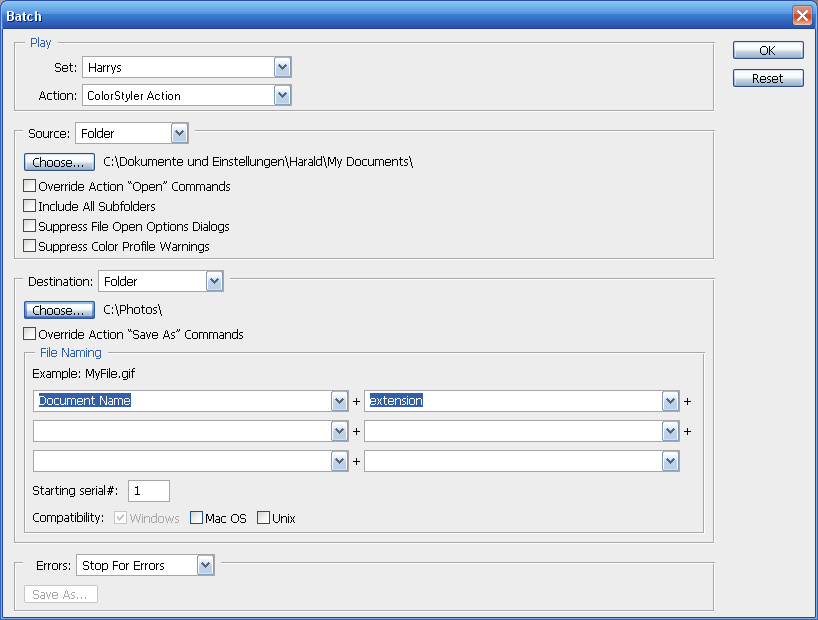 3. In the Batch dialog make sure that your ColorStyler action is selected.