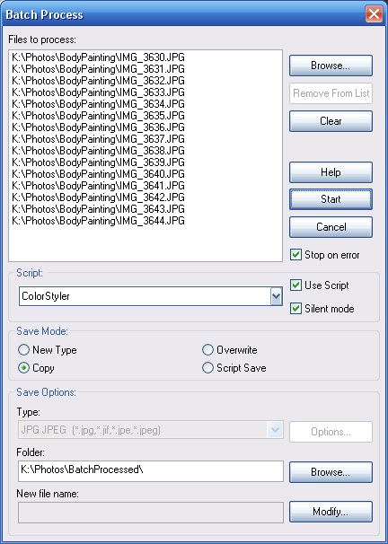 3. In the Batch Process dialog choose your ColorStyler script from the Script frame.