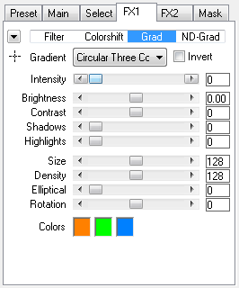 The Grad effect applies a colored gradient to the image. You can choose the type of gradient that you want from the Gradient combo box. You can choose between a linear and circular gradient and between one, two or three colors. Two colors means that one color will start from the top of the gradient and one from the bottom, so that they are cross blended. Three colors means that a third color will be applies in the middle of the gradient, so that it cross blends with the top and bottom color. There is also a Linear Middle Color option in the Gradient combo box, which applies the color in the middle of the gradient and fades it out to the top and the bottom. This option can be used to simulate, e.g. a gold reflector that is used in portrait photography.