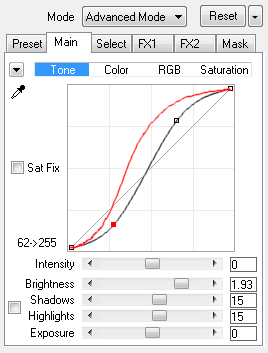 With activated Sat Fix check box the curve and sliders are applied only to the luminance channel of the image. This usually keeps the saturation constant, which can be an advantage or disadvantage depending on the image. When the Sat Fix check box is deactivated, the curve and sliders are applied to all channels.