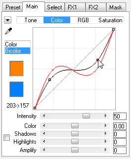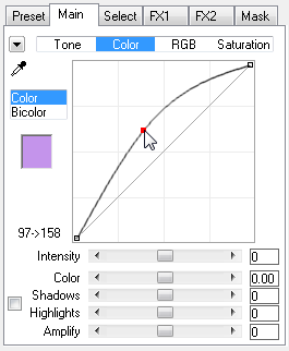The Intensity slider increases or decreases amplitude of the curve and the intensity of the controls on the Color sub tab. It influences both the black curve as well as the other sliders below the curve. Slider values below zero make the red output curve move towards the base line thus decreasing the color effect. Values above zero make the red curve move further away from the base line thus increasing the color effect. At a value of zero the Intensity slider does not influence the curve and the sliders.