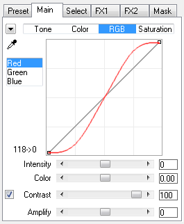 The Intensity slider increases or decreases amplitude of the curves and the intensity of the controls on the RGB sub tab. It influences both the black curve as well as the other sliders below the curve. Slider values below zero make the red output curve move towards the base line thus decreasing the color effect. Values above zero make the red curve move further away from the base line thus increasing the color effect. At a value of zero the Intensity slider does not influence the curve and the sliders.
