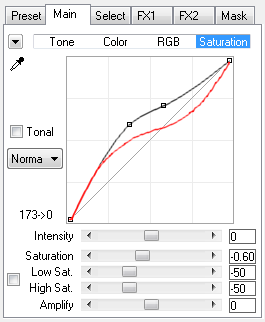 The Intensity slider increases or decreases amplitude of the curve and the intensity of the controls on the Saturation sub tab. It influences both the black curve as well as the other sliders below the curve. Slider values below zero make the red output curve move towards the base line thus decreasing the saturation effect. Values above zero make the red curve move further away from the base line thus increasing the saturation effect. At a value of zero the Intensity slider does not influence the curve and the sliders.