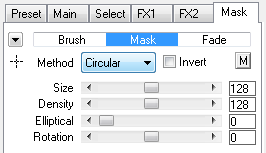 The Circular Mask method creates a circular gradient that is used as a mask. The Size slider determines the size of the circular gradient and the Density slider makes its borders harder or smoother. The Elliptical slider makes the circular gradient elliptical and the Rotation slider rotates it. If the Elliptical slider has a value of zero, the gradient is circular, so using the Rotation slider has no effect. The Invert check box inverts the mask and lets you quickly swap the masked areas.